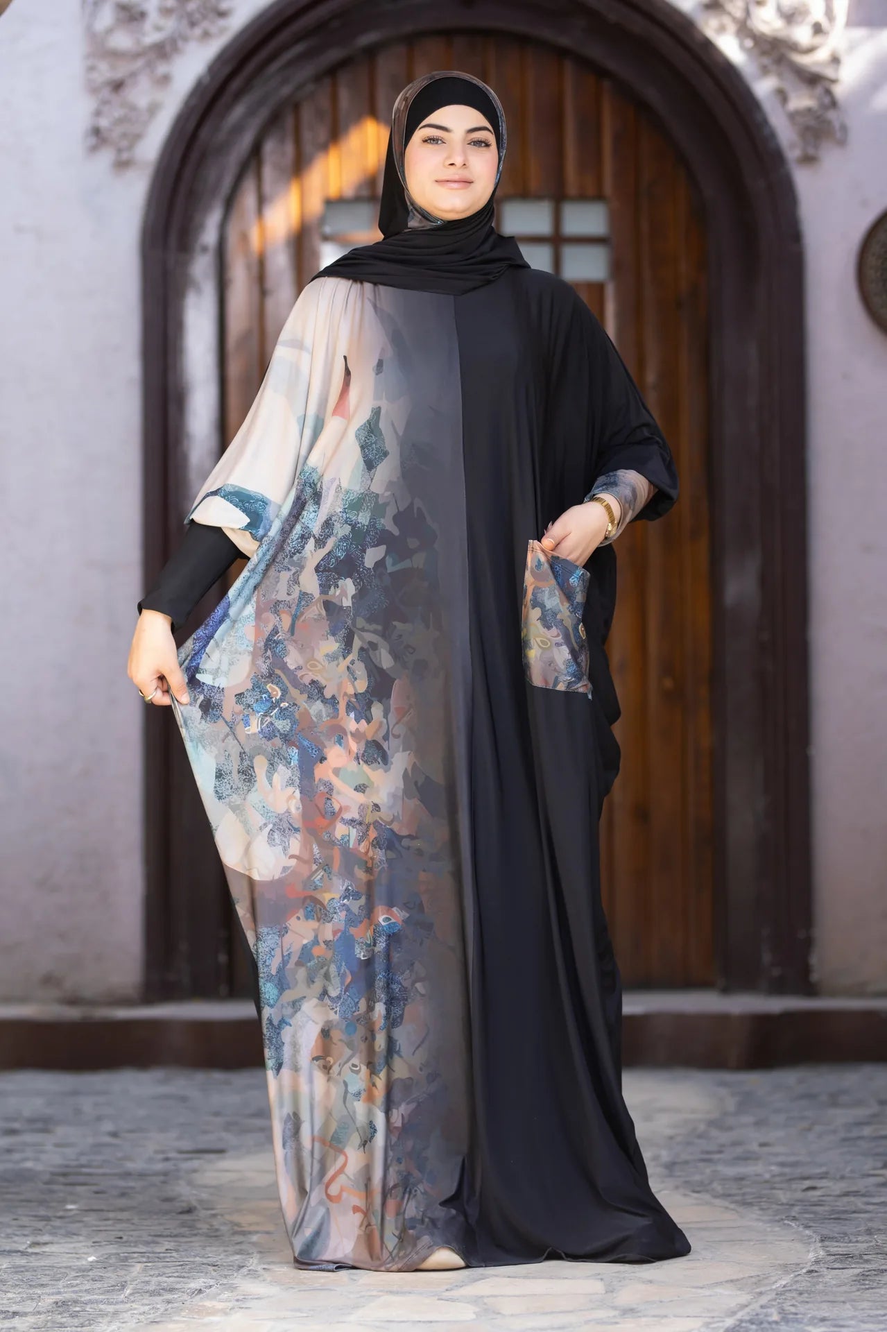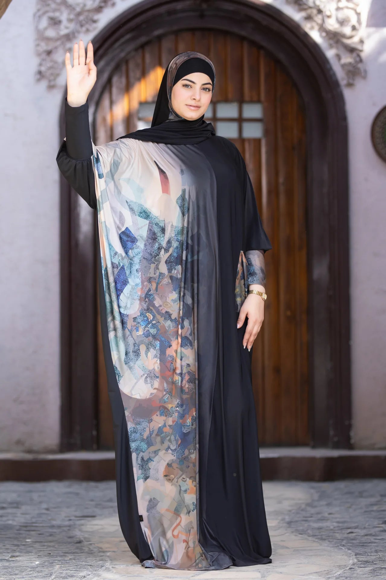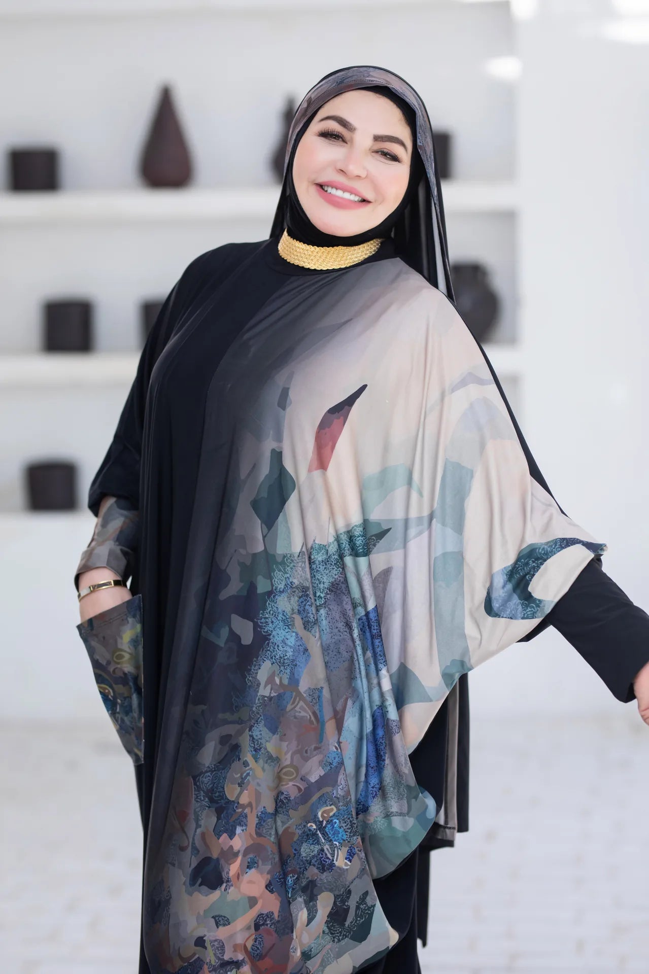 Its delicate drape and subtle artistic print reflect a sense of calm elegance, where comfort meets refined style.